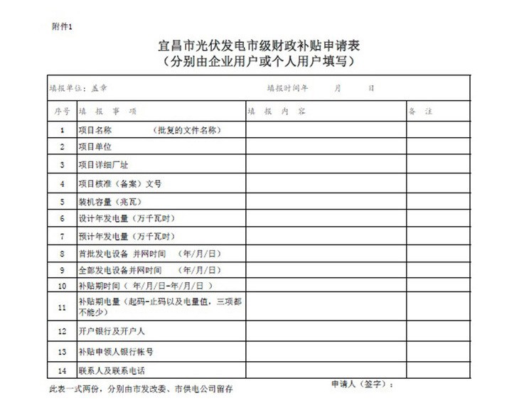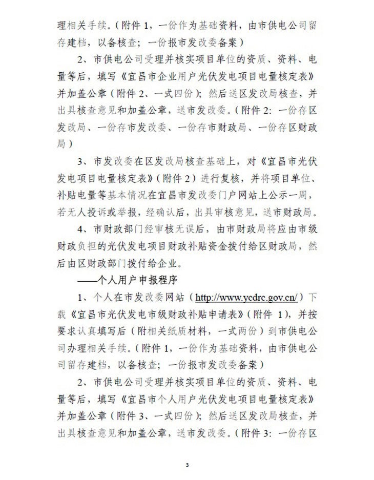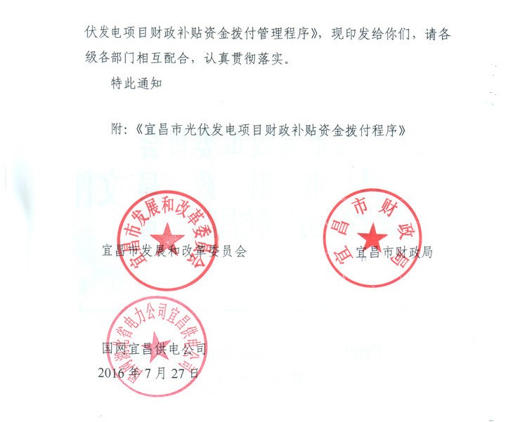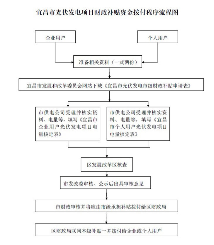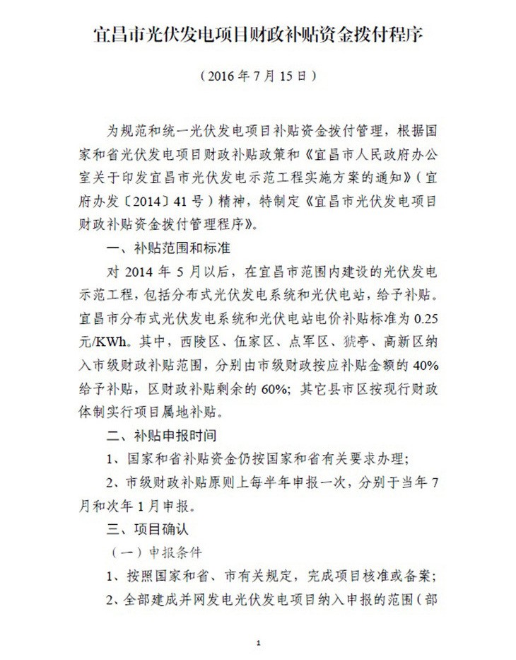為貫徹執(zhí)行《宜昌市人民政府辦公室關(guān)于印發(fā)宜昌市光伏發(fā)電示范工程實(shí)施方案的通知》精神,規(guī)范和統(tǒng)一光伏發(fā)電項(xiàng)目補(bǔ)貼資金撥付管理,落實(shí)宜昌市對分布式光伏發(fā)系統(tǒng)和光伏電站按0.25元/KWh標(biāo)準(zhǔn)給予電價補(bǔ)貼政策,宜昌市人民政府制定了《宜昌市光伏發(fā)電項(xiàng)目財政補(bǔ)貼資金撥付程序的通知》,對補(bǔ)貼范圍、項(xiàng)目確認(rèn)等資金申請程序進(jìn)行了詳細(xì)規(guī)定。以下是通知全文: