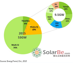 根據(jù)Trend Force旗下新能源事業(yè)處Energy Trend公布的最新數(shù)據(jù),截止2015年10月份,全球光伏中單晶硅片比例進一步攀升至18%,而多晶硅片比例占比進一步萎縮至76%。全球單晶硅片在晶體硅光伏中的占比高于國內。價格方面,目前單晶硅片價格已從2015年年初的US$1.04降至US$0.92~0.93/pc,單晶電池片成本也連帶下降。近期中國市場已出現(xiàn)主流單晶電池價格達到RMB2.35/W,為市場首次出現(xiàn)單晶電池價格等于多晶電池價格,使得單晶硅片在組件端更高的性價比優(yōu)勢進一步凸顯,單晶技術的快速進步在確保利潤的前提下,價格快速下降并逼近多晶價格,并仍然具備比多晶更大的降價空間,在蓄勢搶占多晶市場份額的同時,加速了光伏發(fā)電去補貼實現(xiàn)平價上網(wǎng)的步伐。