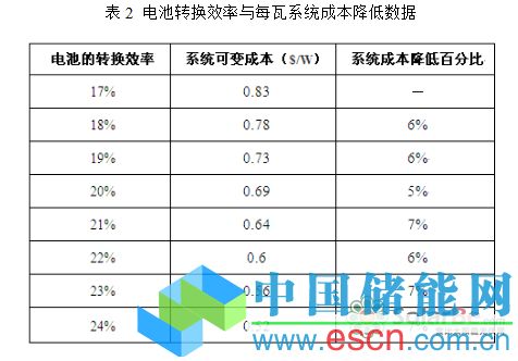 表2 電池轉換效率與每瓦系統(tǒng)成本降低數(shù)據(jù)