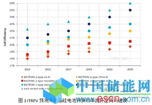 ITRPV也同樣做出權威預測,未來晶硅電池轉換效率提升空間與速度較大的電池主要集中在背接觸、HIT以及PERC單晶電池上,多晶以及類單晶的電池轉換效率提升將遭遇瓶頸,提升空間有限。2025年,單晶電池最高轉換效率有望比多晶電池效率絕對值高出6%,每瓦系統(tǒng)可變成本將下降30-40%左右。