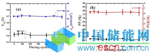 圖2. 在不同彎折次數(shù)下,柔性硅基太陽電池的光伏穩(wěn)定性