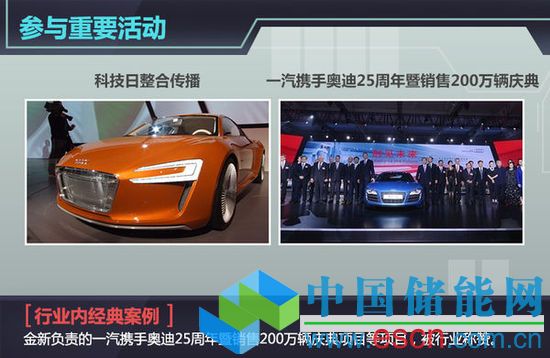 金新自畢業(yè)就進(jìn)入一汽大眾工作,見證了一汽大眾在華輝煌的發(fā)展歷程。其中,在就職一汽大眾奧迪銷售事業(yè)部公關(guān)部公關(guān)經(jīng)理時(shí),其負(fù)責(zé)的“科技日整合傳播”、“一汽攜手奧迪25周年暨銷售200萬輛慶典”等項(xiàng)目,被行業(yè)稱贊,成為經(jīng)典案例。正是因其高水平的工作能力,以及對(duì)整個(gè)汽車行業(yè)的理解較為透徹,被北汽新能源所看重,擔(dān)任北汽新能源品牌總監(jiān)。