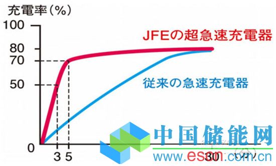 日本JFE-E公司曾提出過(guò)一項(xiàng)新技術(shù),該技術(shù)可以在3分鐘內(nèi)充滿50%,5分鐘充滿70%。JFE開(kāi)發(fā)的新充電方式,主要集中于前5分鐘,就是在前5分鐘盡可能的充最多的電。