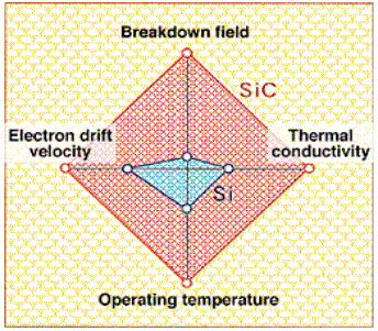 碳化硅物理特性與硅有很大不同。單晶碳化硅比單晶硅具有很多優(yōu)越的物理特性,例如大約10倍的電場強(qiáng)度、大約高3倍的熱導(dǎo)率、大約寬3倍禁帶寬度、大約高一倍的飽和漂移速度。除此之外,在具體的應(yīng)用上,雖然碳化硅器件的工藝難度比單晶硅大很多,但是一旦解決工藝問題,碳化硅器件制造流程短,體積重量小、抗氧化壽命長、輸出功率高的特點(diǎn),將使其成為遠(yuǎn)優(yōu)于單晶硅的21世紀(jì)理想半導(dǎo)體材料。而且碳化硅材料對電力的能耗極低,按照如果年產(chǎn)40萬片碳化硅晶片襯底的計(jì)劃,僅僅應(yīng)用在照明領(lǐng)域,每年減耗的電能就相當(dāng)于節(jié)約2600萬噸標(biāo)準(zhǔn)煤,是一種理想的節(jié)能材料。