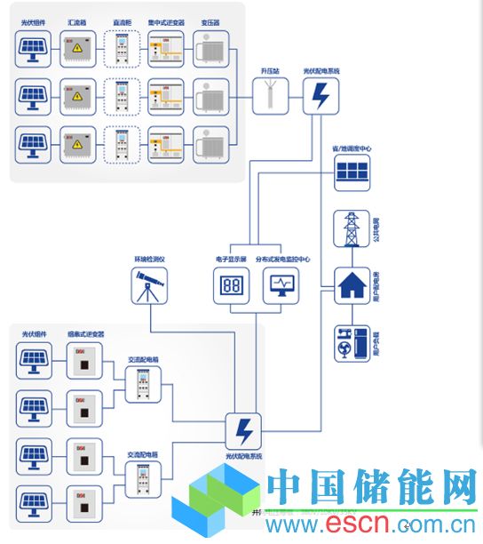 分布式光伏發(fā)電系統(tǒng),是在現(xiàn)場(chǎng)或靠近用電現(xiàn)場(chǎng)配置較小的光伏發(fā)電供電系統(tǒng),以滿足特定用戶的需求,支持現(xiàn)存配電網(wǎng)的經(jīng)濟(jì)運(yùn)行。基本設(shè)備包括光伏電池組件、光伏方陣支架、直流匯流箱、直流配電柜、并網(wǎng)逆變器、交流配電柜等設(shè)備,另外還有EMS供電系統(tǒng)監(jiān)控裝置和環(huán)境監(jiān)測(cè)裝置。