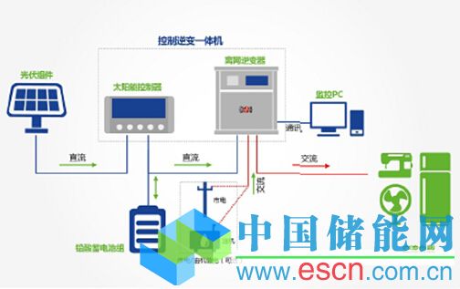 光伏方陣在有效光照的情況下,將太陽(yáng)能轉(zhuǎn)換成電能、給負(fù)載供電、多余的電量給蓄電池充電。當(dāng)發(fā)電量不足時(shí),系統(tǒng)蓄電池組又把存儲(chǔ)的電能通過(guò)逆變器逆變給交流負(fù)載供電??刂葡到y(tǒng)智能管理蓄電池組,同時(shí)滿足負(fù)載的供電需求。