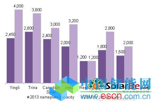 彭博新能源財經(jīng)預(yù)計2014年全球光伏市場增長13-24%,而圖一中的七家大廠計劃出貨量較2013年增幅高達35%,其2014全球市場占有率預(yù)計從2013年的34%增加到37-41%,預(yù)示著一個產(chǎn)業(yè)整合度更高的光伏組件制造環(huán)境。