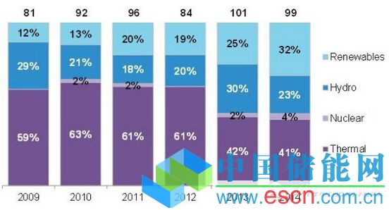 中國儲能網(wǎng)訊:可再生能源在中國蓬勃發(fā)展。2014年風電、太陽能和水電的新增裝機連續(xù)第二年超過煤炭,將占本年度年新增電力裝機的53%。其中風電和太陽能光伏分別預計裝機18吉瓦和13吉瓦,這將使中國成為全世界最大的風電和太陽能市場。根據(jù)彭博新能源財經(jīng)的最新預測,伴隨著這一十年每年18至19吉瓦的風電裝機和最高27吉瓦的2020年太陽能光伏年度新增安裝量,可再生能源在中國的增長趨勢將持續(xù)到2020年。