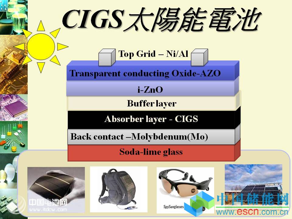 據(jù)了解,所謂CIGS薄膜太陽(yáng)能電池,是由銅(Copper)、銦(Indium)、鎵(Gallium)、硒(Selenium)等幾種化學(xué)元素的化合物作為原料生產(chǎn)的薄膜化合物太陽(yáng)能電池,其制備工藝有共蒸發(fā)法和濺射硒化法等。近年來(lái),CIGS薄膜太陽(yáng)能技術(shù)以其光吸收能力強(qiáng)、發(fā)電性能穩(wěn)定、光電轉(zhuǎn)換效率高、生產(chǎn)制造成本低、能源回收周期短等特點(diǎn),已經(jīng)成為薄膜太陽(yáng)能研究的“寵兒”。