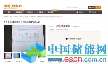 昨日,淘寶拍賣會頁面顯示,*ST超日(2.07, -0.10, -4.61%)旗下一筆資產(chǎn)已拍出。旗下青海錦國興新能源60%的股份拍出2055萬元,僅為投資額三成 拍賣所得將用于支付一筆貨款