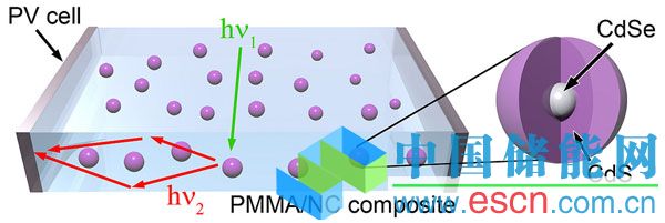 當(dāng)CdS內(nèi)部核心嵌入可將太陽能導(dǎo)入窗緣太陽電池的PMMA窗格時,CdSe量子點吸收光子,然后從CdS核心以不同的波長重新發(fā)射能量。