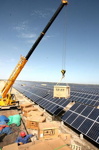 3月24日,河北英利集團(tuán)技術(shù)人員在新疆生產(chǎn)建設(shè)兵團(tuán)第二師二十九團(tuán)吊裝光伏發(fā)電設(shè)設(shè)備。位于新疆巴音郭楞自治州鐵門關(guān)市二十九團(tuán)利用沙漠化土地與河北英利集團(tuán)合作新建的光伏發(fā)電項(xiàng)目總投資12.8億元,規(guī)劃建設(shè)總裝機(jī)容量100兆瓦,日前一期工程即將并網(wǎng)發(fā)電,二期計(jì)劃2015年年底投入使用,每年可為國家電網(wǎng)提供清潔電能13000萬度,年節(jié)約標(biāo)煤41526萬噸,減少二氧化碳約10.8萬噸。