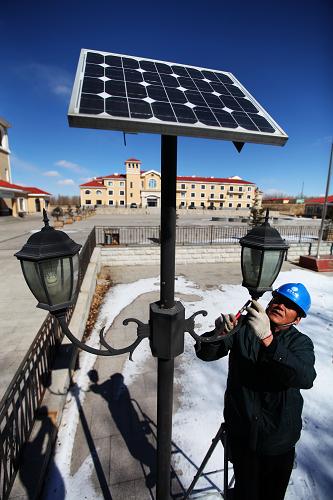 3月4日,國家電網(wǎng)河北省張家口市張北縣供電公司一名工作人員在對(duì)塞那都旅游區(qū)光伏板路燈進(jìn)行檢修。該旅游區(qū)目前安裝光伏板路燈60支,容量150千瓦,日發(fā)電量450度,可供夜晚照明。