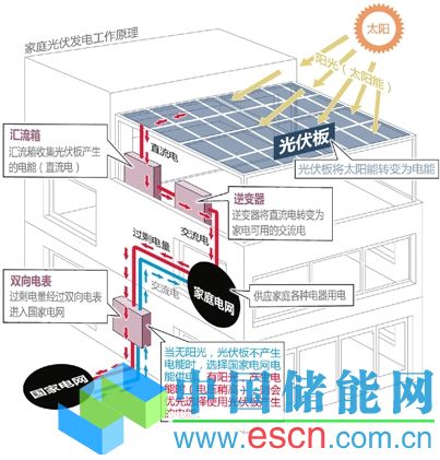 由于光伏電站夜間并不發(fā)電,所以一樓的總閘邊有一個(gè)雙向電表。通過這個(gè)雙向電表,光伏電站發(fā)的電,用不完時(shí)通過電網(wǎng)給別人用;到晚上不發(fā)電時(shí),就從國(guó)家電網(wǎng)輸電進(jìn)來(lái)用。