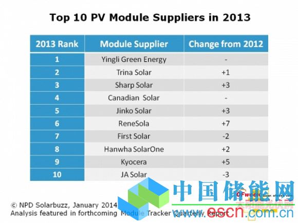 與2012年相似,排名前十位的企業(yè)中有七家是中國(guó)公開上市的垂直一體化晶硅制造商。夏普太陽能、福斯第一太陽能和京瓷是僅有的進(jìn)入2013年榜單的非中國(guó)供應(yīng)商。