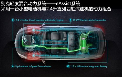 新款君威將采用與君越相同的混動(dòng)技術(shù)——eAssist輕度混合動(dòng)力技術(shù),eAssist油電混合動(dòng)力系統(tǒng),將SIDI智能直噴發(fā)動(dòng)機(jī)與智能電力驅(qū)動(dòng)技術(shù)完美結(jié)合,實(shí)現(xiàn)油與電的能量轉(zhuǎn)換和互補(bǔ),這套動(dòng)力系統(tǒng)將由一臺(tái)2.4升直列四缸汽油發(fā)動(dòng)機(jī)和一組電動(dòng)系統(tǒng)(11kW、107Nm的電動(dòng)機(jī)搭配115V電壓鋰電池)組成。