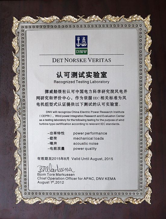 獲得挪威船級(jí)社的認(rèn)可測(cè)試實(shí)驗(yàn)室授權(quán),表明中國(guó)電科院風(fēng)電檢測(cè)能力和試驗(yàn)水平獲得國(guó)際權(quán)威認(rèn)證機(jī)構(gòu)認(rèn)可,對(duì)進(jìn)一步提升中國(guó)電科院在世界風(fēng)電檢測(cè)與認(rèn)證領(lǐng)域的國(guó)際影響力具有重要意義。