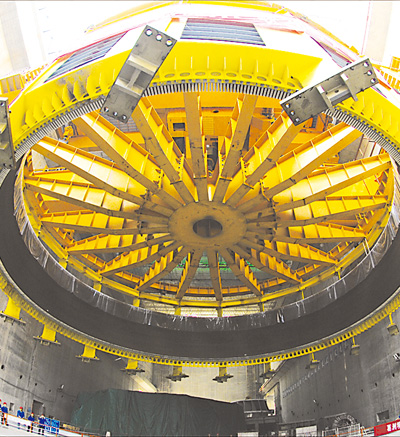 “引進(jìn)、吸收、創(chuàng)新”的“三峽模式”見證了我國水電設(shè)備制造從弱到強(qiáng)的歷程。5月23日,27號機(jī)組成功實(shí)現(xiàn)了72小時(shí)試運(yùn)行。此機(jī)組由東電制造,直徑約10米,高約6米,重近500噸。這是我國企業(yè)自行設(shè)計(jì)生產(chǎn)的目前世界上最大的蒸發(fā)冷卻機(jī)組,采用“定子繞組自循環(huán)蒸發(fā)冷卻”技術(shù),具有世界領(lǐng)先水平。