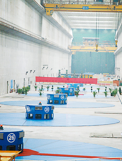 從左岸機(jī)組招標(biāo)時(shí)的配角到右岸機(jī)組時(shí)的主角,我國的水電設(shè)備制造企業(yè)用了5年時(shí)間。地下的6臺70萬千瓦機(jī)組(27-32號機(jī)組)則全部實(shí)現(xiàn)了國產(chǎn)化。首批3臺機(jī)組分別于2011年5月、6月、7月投產(chǎn)。隨著最后一臺機(jī)組的投運(yùn),我國水電設(shè)備制造的綜合實(shí)力。也同步得以見證。