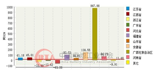 2011年1月~12月全國電池行業(yè)累計(jì)利潤總額主要地區(qū)同比增長情況