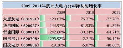 2011年,全社會(huì)用電量較上年度增長(zhǎng)11.7%,全國(guó)發(fā)電量較上年度增長(zhǎng)約11.7%,各大電力公司營(yíng)收不同程度增長(zhǎng),但受水電出力下降、電煤供應(yīng)緊張所導(dǎo)致的煤炭?jī)r(jià)格上漲影響,火電企業(yè)盈利受到較大影響。2011年電力行業(yè)平均凈利潤(rùn)增長(zhǎng)率為-85.47%。