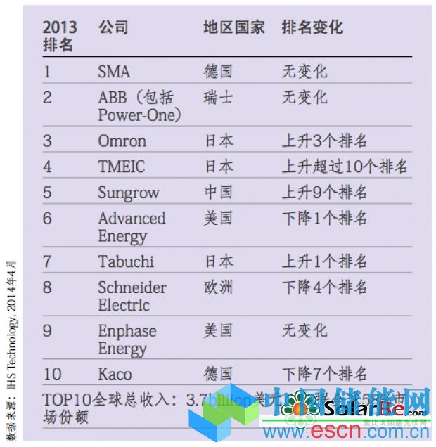 表一:2013年全球光伏逆變器企業(yè)TOP10排名,數(shù)據(jù)來(lái)源:IHS Technology,April 2014