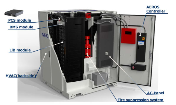 目前,NEC公司在日本大部分銷售活動都集中在2019年2月推出的分布式儲能單元。該儲能單元主要針對商業(yè)和工業(yè)(C&I)客戶,其容量從40kW/ 90kWh到240kW/540kWh不等,將電源轉換器和內(nèi)置連接器集成在一起,便于安裝。最多可組合五個儲能單元,容量最多可達到1200kW/2700kWh。