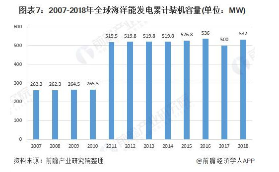 發(fā)電在可再生能源發(fā)電中所占比例最小,大多數海洋發(fā)電項目側重于規(guī)模相對較小的示范項目和不到1MW的試點項目。2018年,全球新增的海洋發(fā)電裝機容量約2MW,總裝機容量約532MW。兩次潮汐攔蓄作用占總數的90%以上,發(fā)展活動遍布世界各地,但主要集中在歐洲,特別是蘇格蘭海岸,2018年在那里部署了大量的潮汐渦輪機。海洋能源的資源潛力空間很大,但盡管經過幾十年的發(fā)展努力,它在很大程度上仍未得到大規(guī)模的開發(fā)利用。
