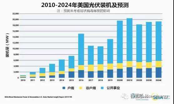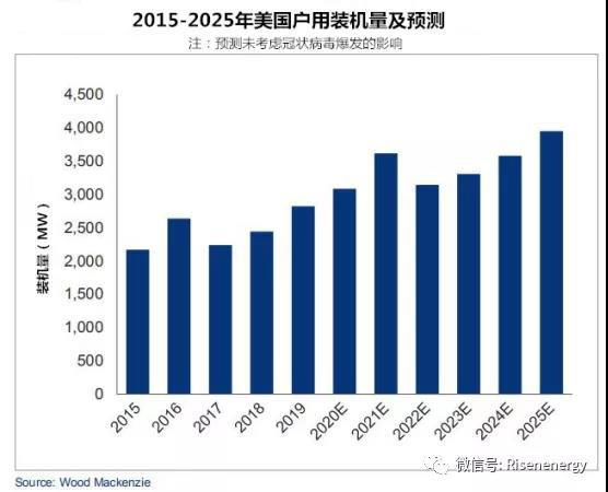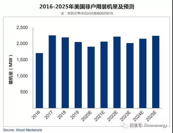 Wood Mackenzie預(yù)測2020年美國光伏產(chǎn)業(yè)的年增長率為47%,預(yù)計裝機量將達到20GW。在未來五年中,美國光伏總裝機容量將增加一倍以上,到2021年,年裝機規(guī)模將達到20.4GW。到2025年,將有三分之一的戶用太陽能系統(tǒng)和四分之一的非戶用太陽能系統(tǒng)配備儲能。