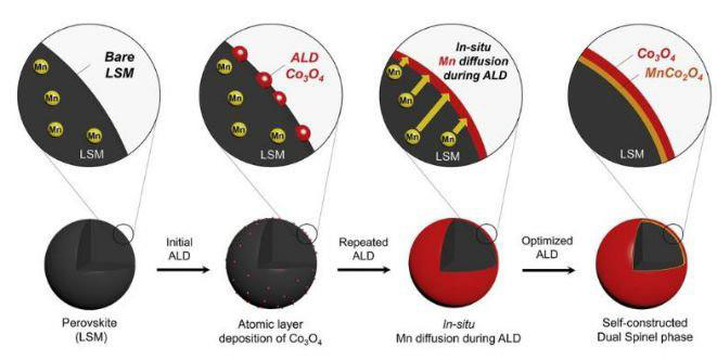 “在原子層沉積(ALD)過程的反復(fù)沉積和氧化循環(huán)中,Mn陽離子從LSM 擴散到Co3O4中,因此,LSM-20-Co催化劑由LSM封裝而成,該LSM被自重構(gòu)尖晶石中間層(Co3O4 / MnCo32O4 / LSM)?!?