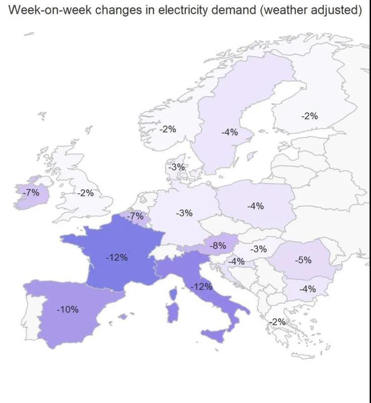根據(jù)ember-climate.org網(wǎng)站匯總的數(shù)據(jù),隨著疫情的蔓延3月2日至8日這一周與上一周相比,歐洲各國電力需求(氣溫變化已經(jīng)調(diào)整)下降在-2%到-12%之間,具體如下: