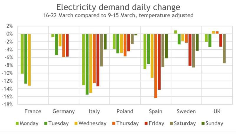 電力需求可視為國家經(jīng)濟健康狀況的“體溫”,那么疫情之下歐洲國家電力需求下降了多少?