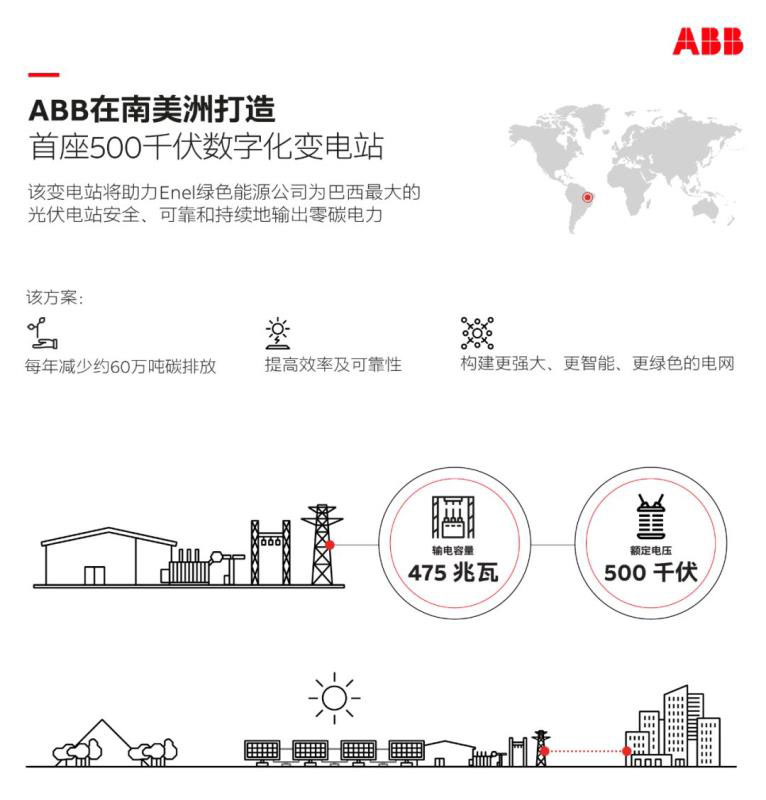 Enel綠色能源公司選擇ABB的技術(shù)建設(shè)變電站,將南美洲最大的太陽能光伏電站S?o Gon?alo電站 (位于巴西東北部皮奧伊州)發(fā)出的零碳排太陽能電力輸送到巴西500kV輸電網(wǎng)中。該電站為全球首個(gè)500kV交流數(shù)字化變電站。