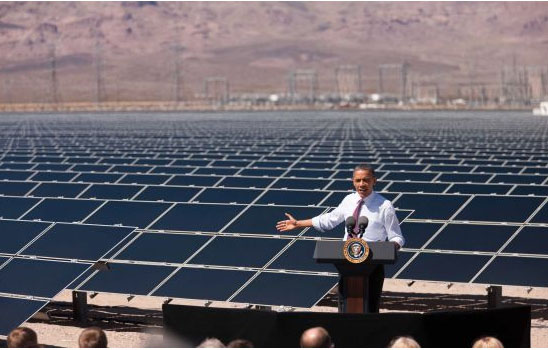 美國前總統(tǒng)奧巴馬在內(nèi)華達州的一個太陽能發(fā)電場開通儀式上致辭