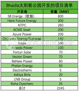 Bhadla太陽(yáng)能公園開(kāi)發(fā)項(xiàng)目一覽表
