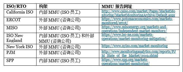 每個(gè)ISO / RTO的詳細(xì)市場和運(yùn)營規(guī)則均需獲得FERC的批準(zhǔn)[12],其中包括確保MMU具有獨(dú)立地位的陳述。有幾個(gè)ISO / RTO(作為FERC批準(zhǔn)的市場監(jiān)測計(jì)劃的一部分)將獨(dú)立監(jiān)測功能外包給具有專業(yè)經(jīng)驗(yàn)的咨詢公司[13]。參見表1。如果獨(dú)立的MMU由ISOs / RTO的員工(而非咨詢公司員工)組成,則被稱為“內(nèi)部獨(dú)立市場監(jiān)測部門” [14]。但是,ISOs / RTO的管理層不能控制或者對其施加權(quán)力。例如,在稱為SPP(西南電力庫)的ISO / RTO中有一個(gè)內(nèi)部MMU,經(jīng)FERC批準(zhǔn)的管理規(guī)則規(guī)定:“應(yīng)授予市場監(jiān)測機(jī)構(gòu)完全的獨(dú)立性,以開展為提供公正和有效市場監(jiān)測所需的活動(dòng)?!盵15] 此外,根據(jù)SPP規(guī)則,“市場監(jiān)測機(jī)構(gòu)在制定和完成報(bào)告時(shí)應(yīng)具有完全的獨(dú)立性,任何個(gè)人或?qū)嶓w都不得篩選、更改、刪除或延遲市場監(jiān)測機(jī)構(gòu)的發(fā)現(xiàn)、結(jié)論和建議?!盵16]