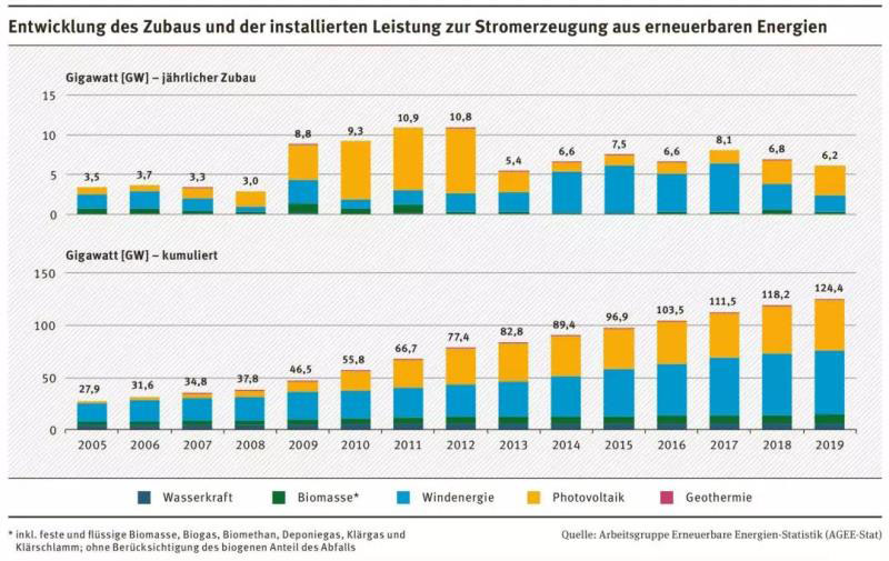 根據(jù)德國AFEE-Stat最新發(fā)布的數(shù)據(jù),2019年德國新增可再生能源發(fā)電容量6.2吉瓦,連續(xù)第2年下降,比2011年的增量峰值(10.9吉瓦)減少43%。至2019年底,德國可再生能源發(fā)電裝機為124.4吉瓦,比2018年增長5.2%。