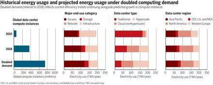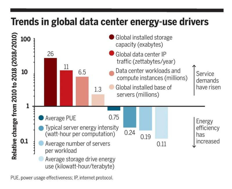 《科學(xué)》雜志發(fā)表美國(guó)西北大學(xué)等學(xué)者的文章,評(píng)估數(shù)據(jù)中心的電力消耗。2010年至2018年間全球?qū)?shù)據(jù)中心服務(wù)的需求增長(zhǎng)了550%,但同期這些設(shè)施的能源使用僅增長(zhǎng)了6%。在全球最大的數(shù)據(jù)中心市場(chǎng)美國(guó),其能源需求實(shí)際上在這段時(shí)間內(nèi)趨于平穩(wěn)——這與21世紀(jì)初的情況大相徑庭,當(dāng)時(shí)數(shù)據(jù)中心產(chǎn)出翻番意味著能源需求翻番。