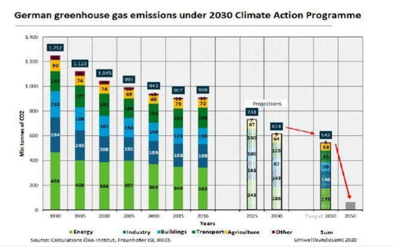 在應(yīng)用生態(tài)研究所(ko-Institut)的主持下進(jìn)行的分析發(fā)現(xiàn):“根據(jù)當(dāng)前的氣候行動(dòng)計(jì)劃,將無(wú)法實(shí)現(xiàn)2020年和2030年的氣候目標(biāo)?!闭兄Z在2019年9月啟動(dòng)該計(jì)劃后,將對(duì)其有效性進(jìn)行獨(dú)立評(píng)估。該計(jì)劃中的措施,例如運(yùn)輸和供暖的國(guó)家碳價(jià),電動(dòng)汽車(chē)的大規(guī)模推廣以及平行煤電等,到2030年逐步淘汰二氧化碳的排放量應(yīng)從2018年的858噸減少至5.43億噸。但是,研究發(fā)現(xiàn),減排量實(shí)際減少約7000萬(wàn)噸。