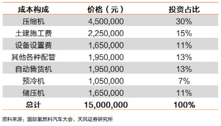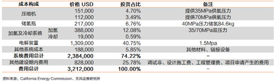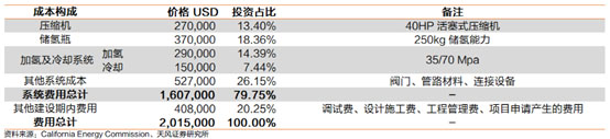 總體上,加氫站建成所需的與設(shè)備相關(guān)的費(fèi)用約為160萬美元,考慮投入使用前所需的調(diào)試費(fèi)用、工程設(shè)計(jì)費(fèi)用、管理費(fèi)用、建筑施工費(fèi)用等其他費(fèi)用,總成本將超過200萬美元。