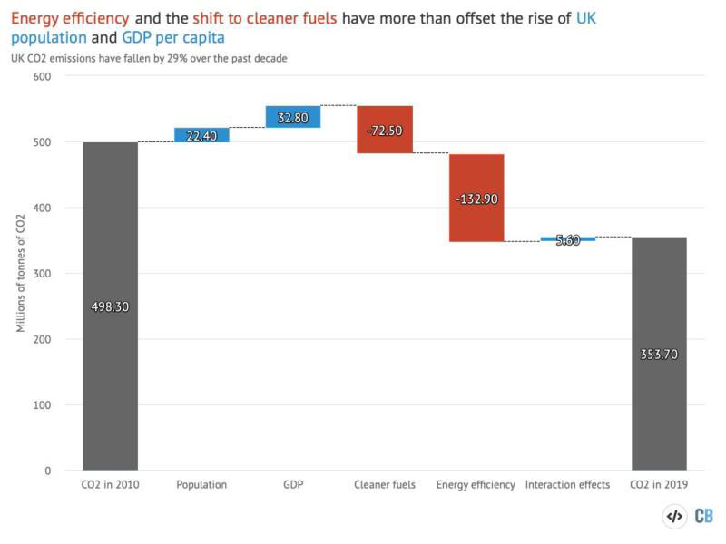 英國二氧化碳排放的下降主要靠能效的提高和低碳能源替代。與2010年(碳排放4.98億噸)相比,因?yàn)槿丝谠黾訉?dǎo)致碳排放增加2240萬噸、經(jīng)濟(jì)增長導(dǎo)致碳排放3280萬噸,而低碳能源替代導(dǎo)致碳排放下降7250億噸,而能效的提高導(dǎo)致碳排放下降高達(dá)1.33億噸。