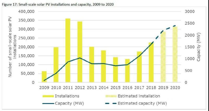 自小型可再生能源計(jì)劃(SRES)實(shí)施以來(lái),總裝機(jī)容量達(dá)10.3GW,其中99.9%來(lái)自小型光伏發(fā)電,其余來(lái)自小型風(fēng)能和水能發(fā)電。到2019年,估計(jì)澳大利亞小型光伏發(fā)電裝機(jī)容量已達(dá)到22GW。