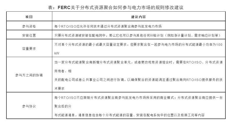 2016 年, 加利福尼亞獨立系統(tǒng)運營商(CAISO)、賓州-新澤西-馬里蘭州際聯(lián)合電力系統(tǒng)運營商(PJM)、紐約獨立系統(tǒng)運營商MYISO紛紛向FERC提出建議,申請修改其市場規(guī)則,推動分布式能源聚合參與電力市場交易。為了響應(yīng)這些提案,2016 年11 月,F(xiàn)ERC發(fā)布了市場規(guī)則修改建議公告,針對如何消除電儲能和分布式能源聚合參與批發(fā)電力的障礙提出建議。公告首先明確了電儲能的定義,即“電儲能指存儲來自電網(wǎng)的電力、稍后再送電給電網(wǎng)的各種儲能技術(shù),包含電池、飛輪、壓縮空氣儲能、抽水蓄能等,且該定義與容量大小無關(guān),與其在電力系統(tǒng)中的安裝位置也無關(guān)?!贬槍Ψ植际侥茉淳酆?,F(xiàn)ERC 提出要求每個RTO/ISO 都明確分布式能源聚合商的定義,并將其作為一類市場參與者,能夠在現(xiàn)有的模式下參與到批發(fā)電力市場中。公告還從分布式能源聚合參與電力市場的資格、安裝位置、容量要求、參與方之間的協(xié)調(diào)、協(xié)議等方面提出的建議,見下表。