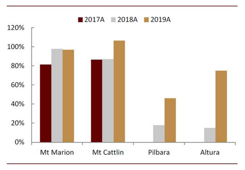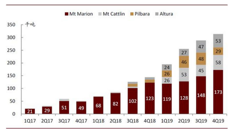 鋰精礦庫(kù)存累積情況較為嚴(yán)重。根據(jù)我們測(cè)算,從1Q2017開始,Mt Marion、Mt Cattlin、Pilbara和Altura項(xiàng)目的鋰精礦庫(kù)存累計(jì)上升31.3萬噸(約合4.6萬噸碳酸鋰當(dāng)量)。我們認(rèn)為當(dāng)前較高的庫(kù)存水平也會(huì)抑制2020年礦山生產(chǎn)的積極性。