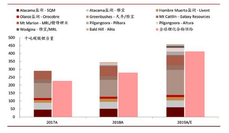 注:Atacama鹽湖(雅寶)和Wodgina產(chǎn)量為我們估算值;SQM和Greenbushes的2019年產(chǎn)量尚未公布,為我們預(yù)測(cè)值。