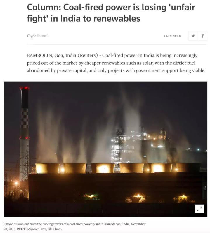 據(jù)路透社報道,印度的燃煤發(fā)電越來越被太陽能等更便宜的可再生能源擠出市場,印度的煤炭行業(yè)處于困境之中。印度煤電遇到的問題原因主要是經(jīng)濟上的,而不是政策上的??稍偕茉纯稍谫忞妳f(xié)議中以每千瓦時3盧比(4.2美分)的價格提供,而現(xiàn)有的在運煤炭廠發(fā)電量以每千瓦時4盧比的價格提供,而新建煤電廠的價格在每千瓦時5至6盧比之間。