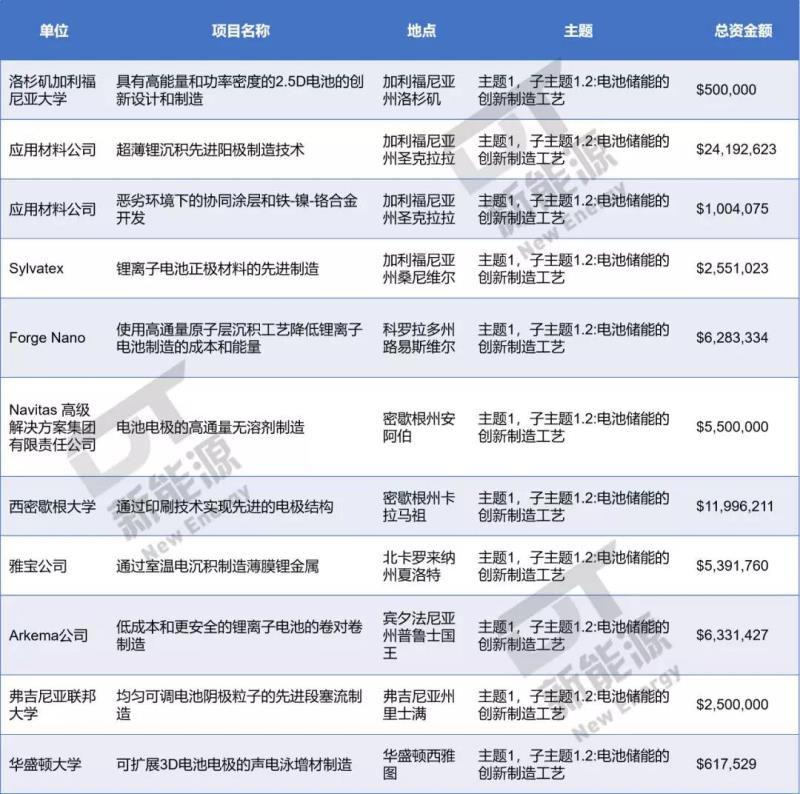 這些項(xiàng)目涵蓋陽極制造工藝、涂層技術(shù)、陰極制造工藝、3D打印電池等多個(gè)技術(shù)領(lǐng)域,負(fù)責(zé)單位從大學(xué)到企業(yè)都有涉及。