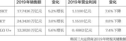 在2019年5G商用元年里,由于5G第一波高端用戶的終端補(bǔ)貼和營銷費(fèi)用提升,韓國三大運(yùn)營商在2019年的整體營業(yè)利潤都同比下滑。其中,KT同比下滑最多,為8.8%;LG U﹢下滑最少,為7.4%。