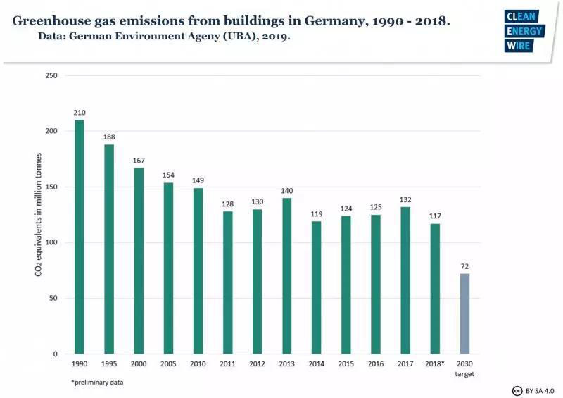由于德國2200萬棟建筑物中超過90%是用石油和天然氣作為燃料的,因此該行業(yè)的排放非常高。德國政府的目標是到2050年實現(xiàn)“近零排放的建筑”。但是,盡管建筑部門碳排放量自1990年以來下降了44%,但自2011年以來基本上停滯不前。節(jié)能建筑對于供暖轉(zhuǎn)型至關(guān)重要,經(jīng)濟部估計到2020年代中期,德國1900萬棟居民住宅中約有一半需要翻新,目標是每年實現(xiàn)2%的翻新改造速度,但目前約為所需速度的一半。原因是這些數(shù)以百萬計的建筑物有數(shù)以百萬計的所有者,獲得他們的同意以接受更嚴格的排放政策和激勵措施是政治上的“老大難”。