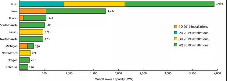 2019年,美國19個州共計有55個新增風(fēng)電場開始運行。其中得克薩斯州和愛荷華州是美國風(fēng)電裝機容量最大的兩個州,長期以來一直是美國風(fēng)電領(lǐng)域的引領(lǐng)者,2019年更是取得了重大進展。德克薩斯州2019年新增風(fēng)電項目近4GW,愛荷華州新增風(fēng)電項目1.7GW,這也突破了他們之前的單年安裝新記錄。伊利諾伊州,南達科他州和堪薩斯州紛紛排在年度前五。愛荷華州是第二個裝機容量超10000MW的州,而伊利諾伊州則成為了第六個裝機容量超5000MW的州。